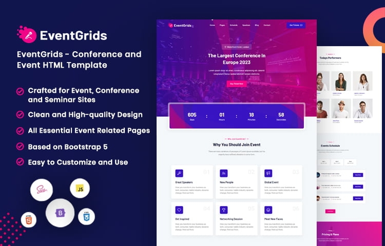 EventGrids is free and premium HTML website template for - Event, Seminar and Conference. This template comes with high-quality design and everything you need to create a complete event website. EventGrids is based on latest Bootstrap 5 and have all essential sections and pages you need.